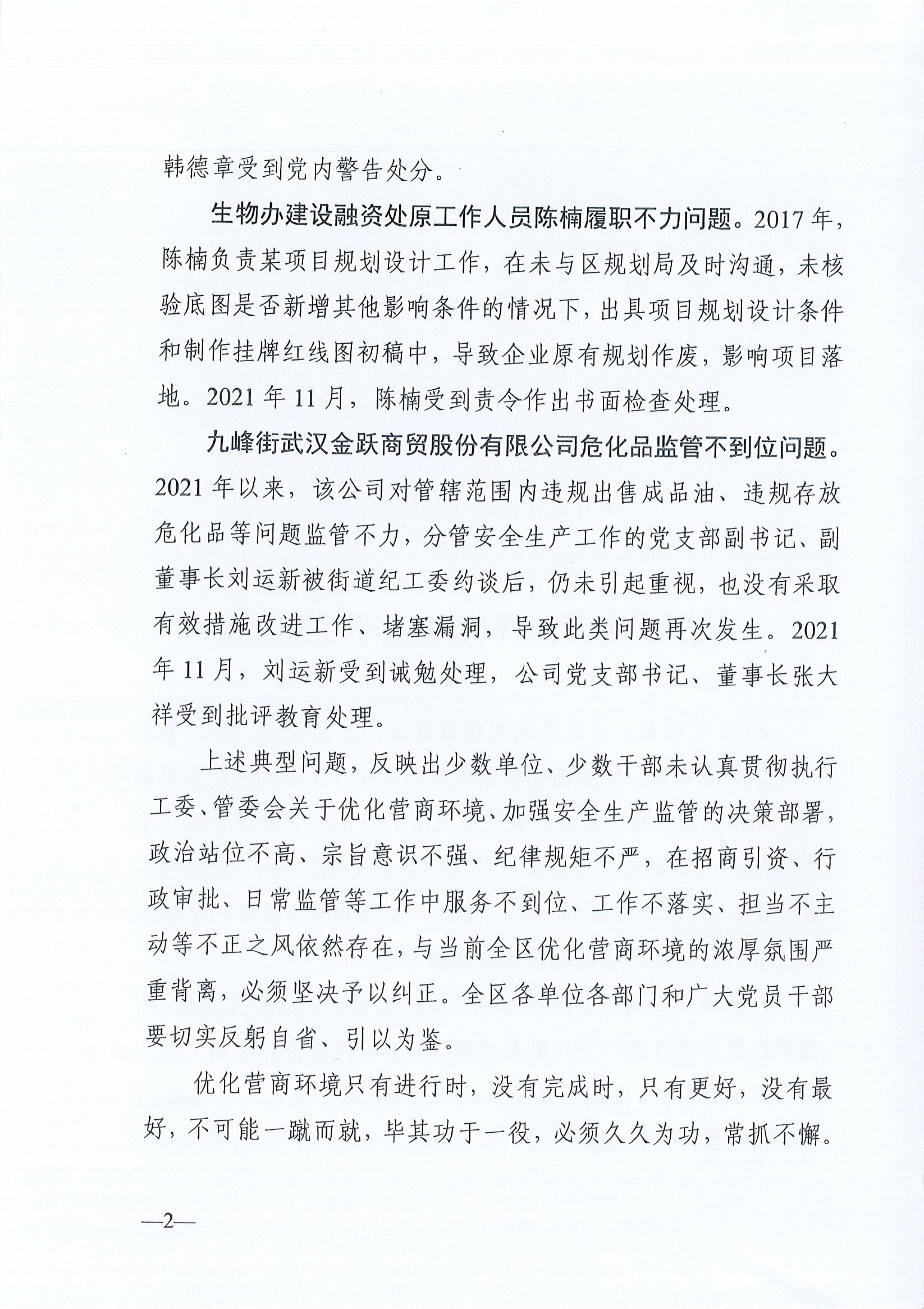 派出东湖高新区纪检监察工委关于损害营商环境典型问题的通报