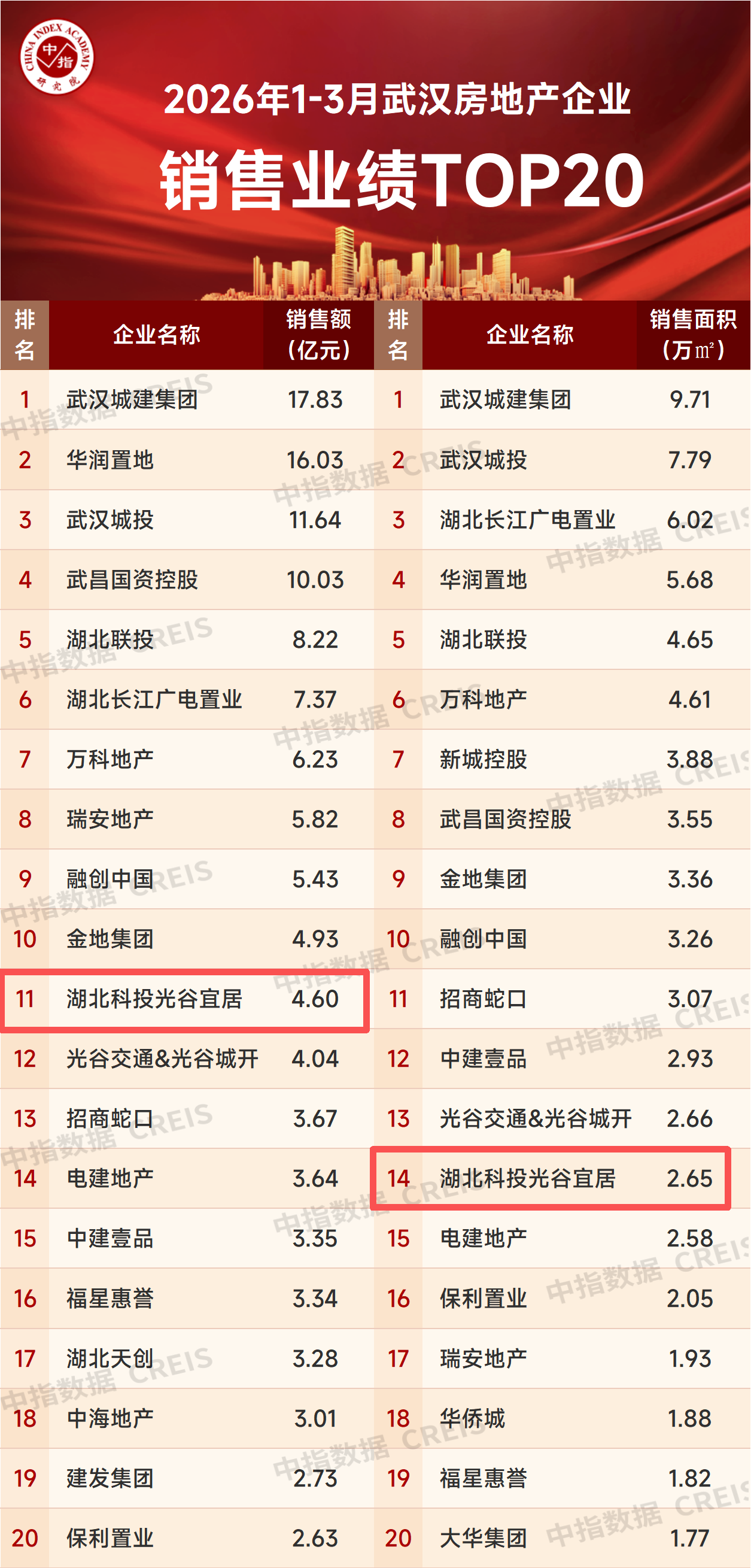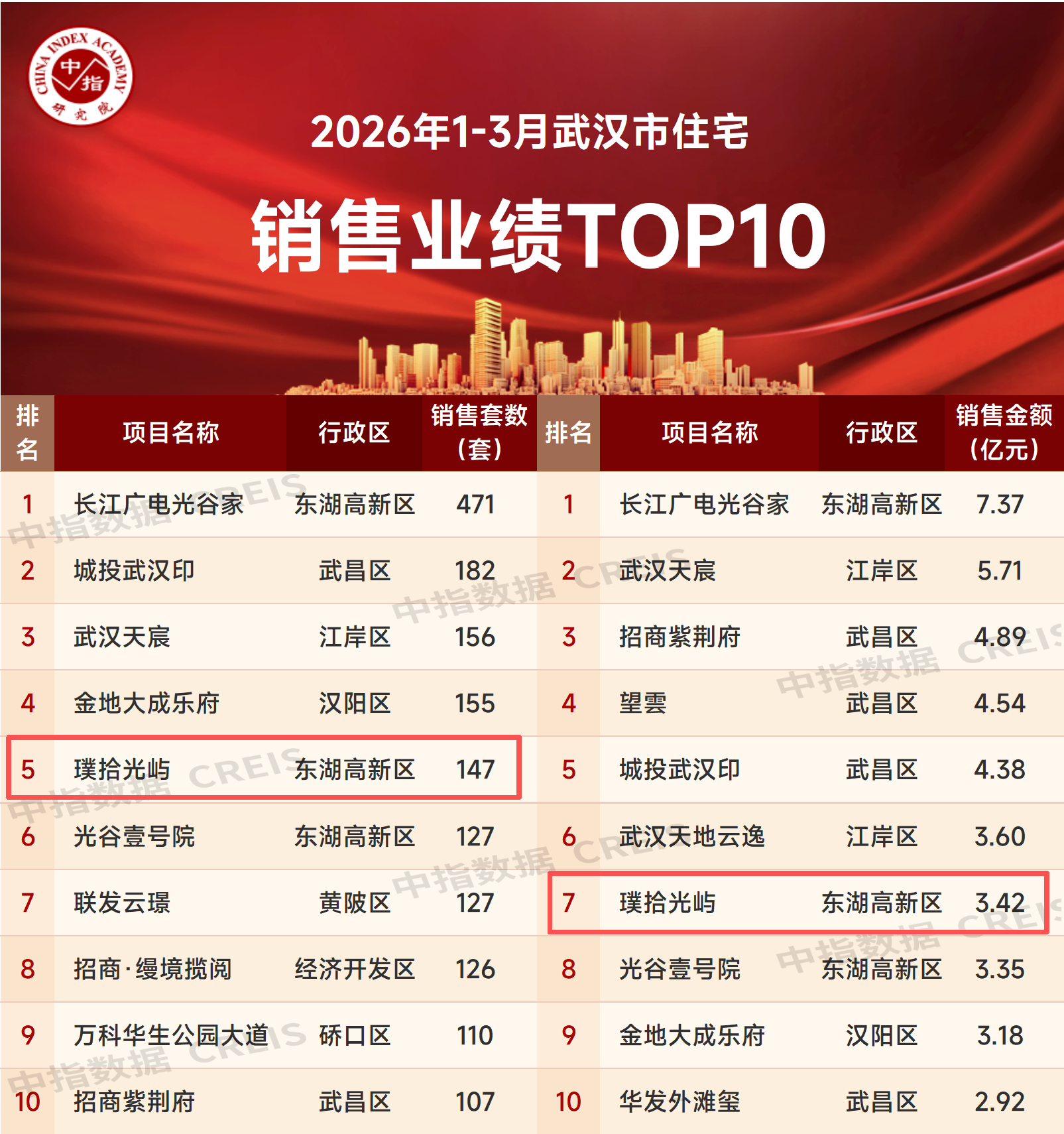 近日,中指研究院发布了《2026年1-3月武汉房地产企业销售业绩TOP20》榜单。在中指研究院榜单中,PG娱乐官方平台 旗下光谷宜居公司1-3月全口径销售面积、销售金额指标均位居前列;璞拾光屿作为今年入市新盘,去化表现不凡,在2026年1-3月武汉市住宅销售套数TOP10中排名第五,赢得广泛的市场与客户认可。
